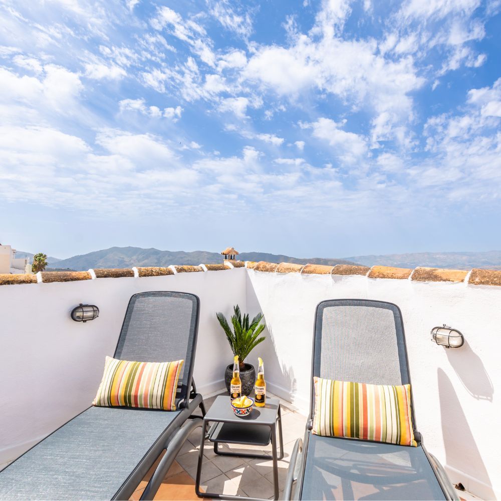 Vanaf de dakterrassen kijk je uit over de vallei, de bergen en de zee, het perfecte decor voor een trage ochtend met koffie of een avond onder de sterren. Op heldere dagen kun je zelfs Marokko zien liggen.